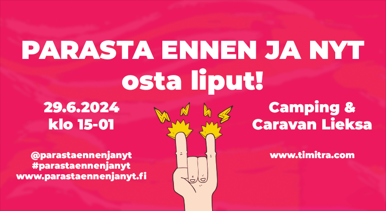 Parasta Ennen ja Nyt 2024 OHJELMA JA LIPUT Ohjelma julkaistaan 1.5.2024, ja samalla voit ostaa lippusi jo ennakkoon! Vältä jonotusta, ja osta lippusi jo nyt. OHJELMA LIPUT Jaa: Jaa Facebookissa(Avautuu uudessa ikkunassa) Facebook Tykkää Lataa...